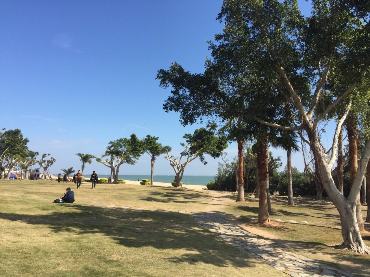 环岛路超级好。美极了!白沙滩、蓝海、木栈道、岸上的各种树、海边双人自行车的游人、各路大巴,构成一幅完美的图画。坐在沙滩上,海风徐徐吹来,惬意极了