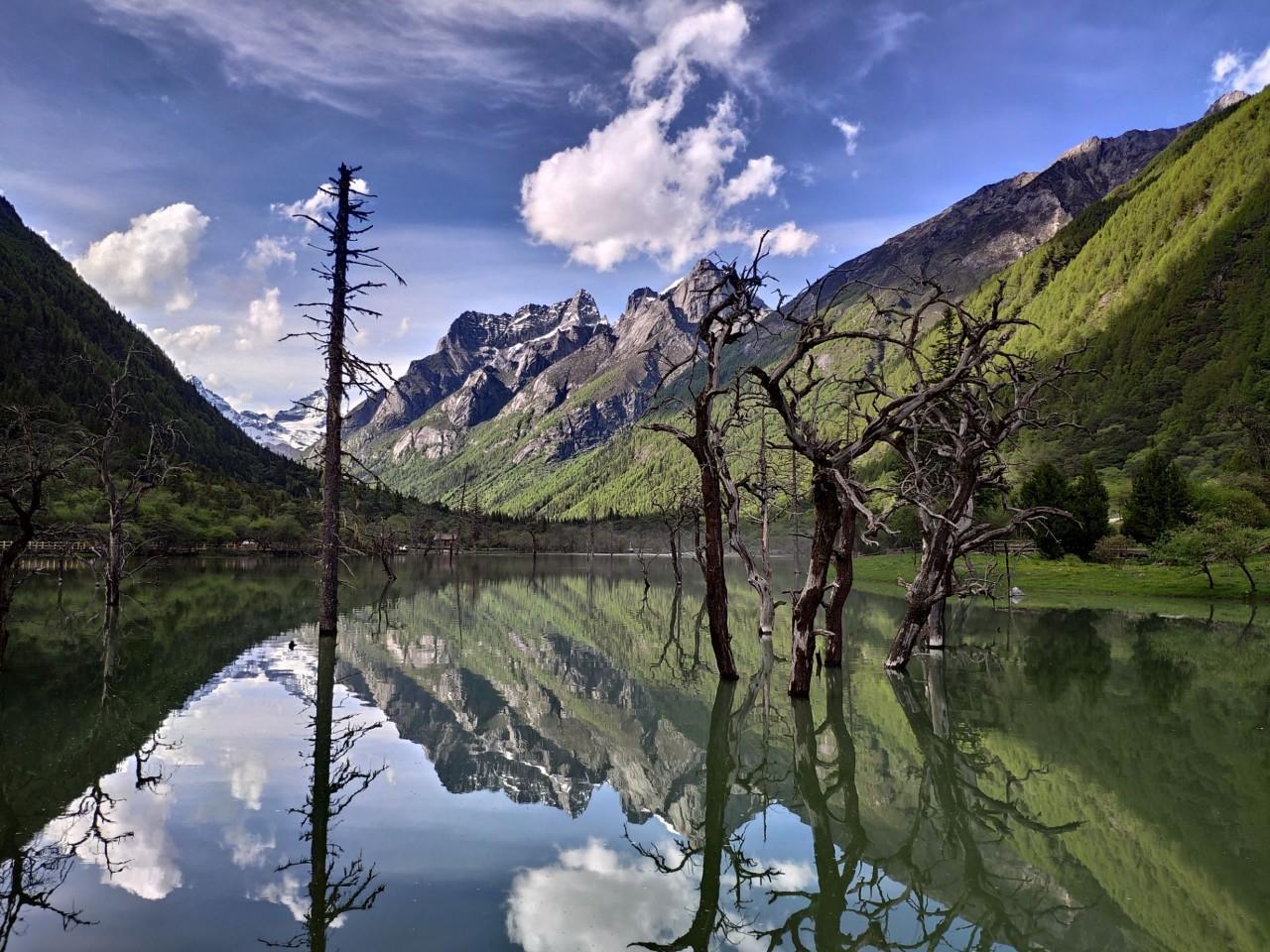 夏天的四姑娘山碧水蓝天,山峰巍峨,环境优美,清新动人