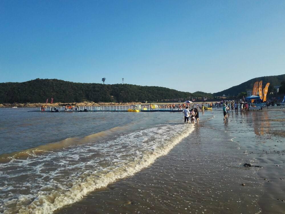 松兰山海滨浴场不错,风景很好。第一次下海,第一次在海里游泳,感觉很不错。松兰山海滨浴场分为东沙和南沙两个沙滩,东沙比较大南沙很小,只能在规定的区域内游泳,前几天台风浪比较大,东沙的游乐项目比较多,坐个太阳伞也是要收费的,海边太阳下防晒要做好